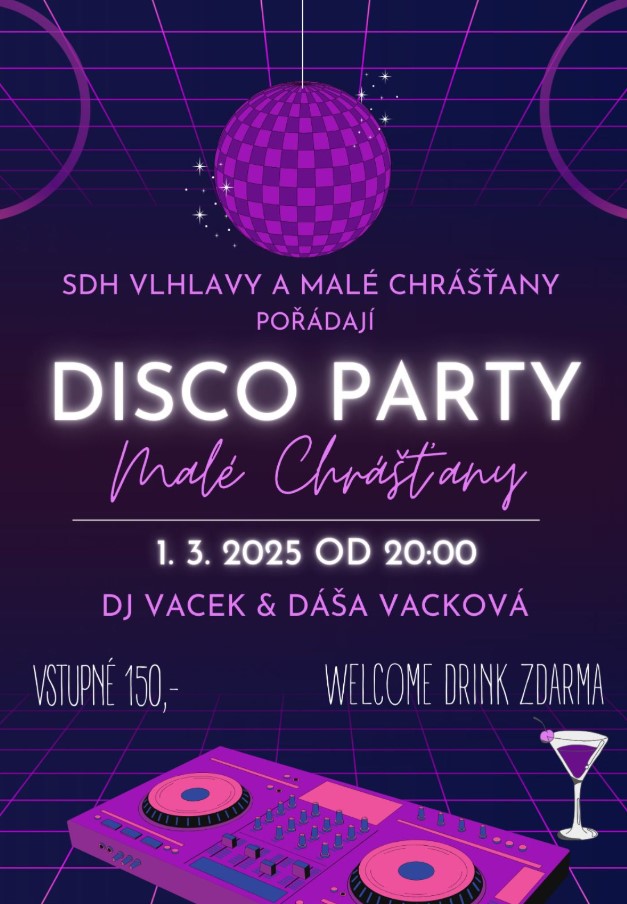 SDH Vlhlavy a Malé Chrášťany Vás zvou na DISCO PARTY. Sobota 1. 3. 2025 od 20 hod. Myslivecká Chatrč v Malých Chrášťanech. Hudba: DJ Vacek & Dáša Vacková. Vstupné 150,- Kč. Welcome drink zdarma.