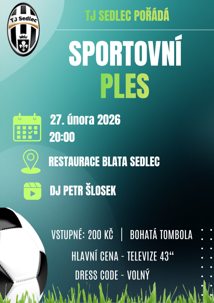 TJ Sedlec Vás srdečně zve na SPORTOVNÍ PLES. 27. února 2026 od 20:00 v restauraci Blata Sedlec. Hraje DJ Petr Šlosek. Bohatá tombola. Dress Code volný. Vstupné 200,- Kč.