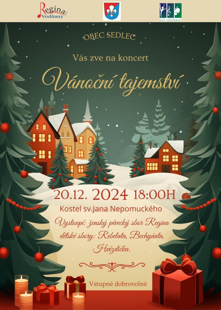 Obec Sedlec Vás srdečně zve na koncert VÁNOČNÍ TAJEMSTVÍ. Vystoupí ženský pěvecký sbor Regina a dětské sbory Rebelata, Bechyňata, Hvězdička. Kostel sv. Jana Nepomuckého v Sedlci. V pátek 20.12.2024 od 18:00. Vstupné dobrovolné.