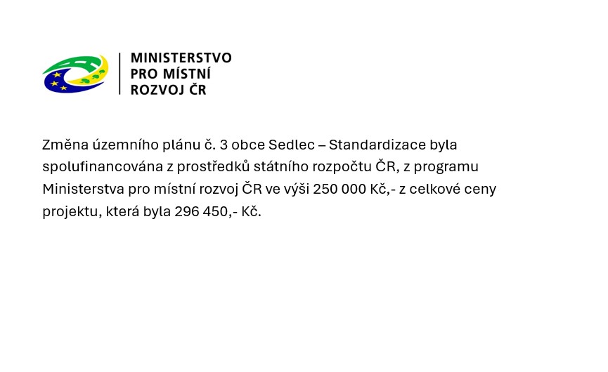 Obec Sedlec úspěšně dokončila projekt Změny územního plánu č. 3 – Standardizace. Cílem byla konverze stávajícího územního plánu do jednotného standardu územně plánovací dokumentace.